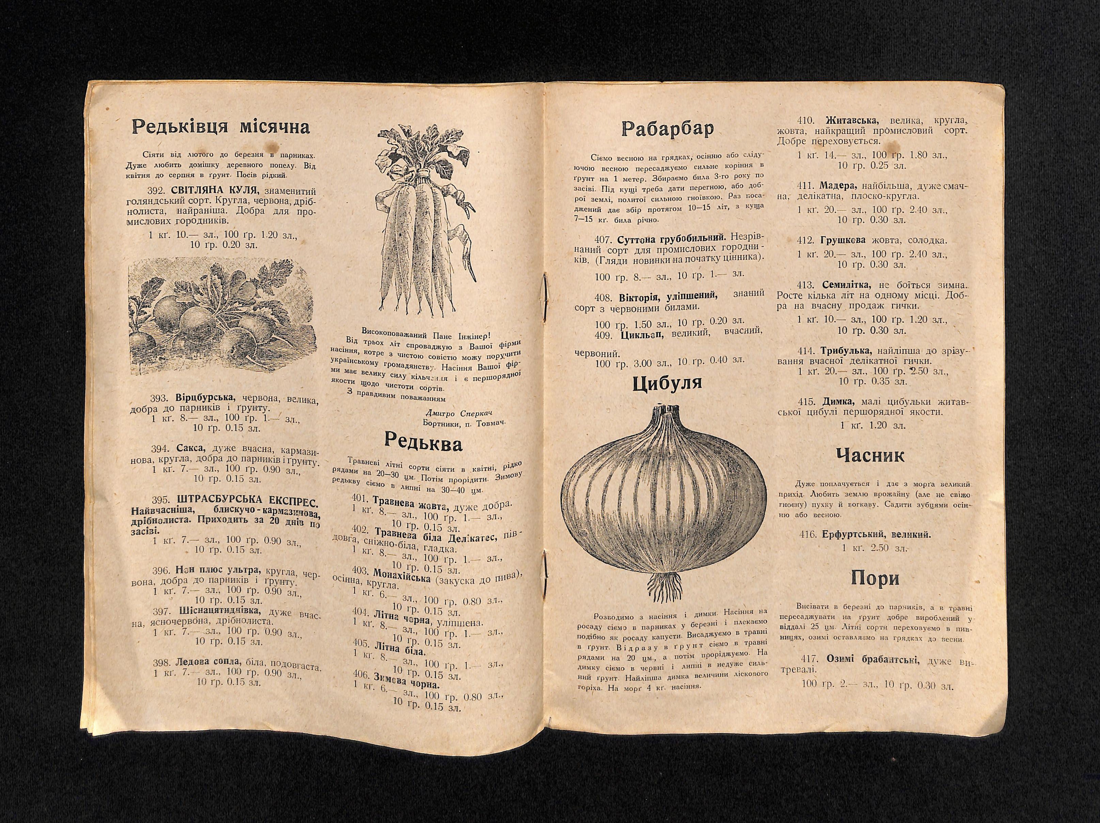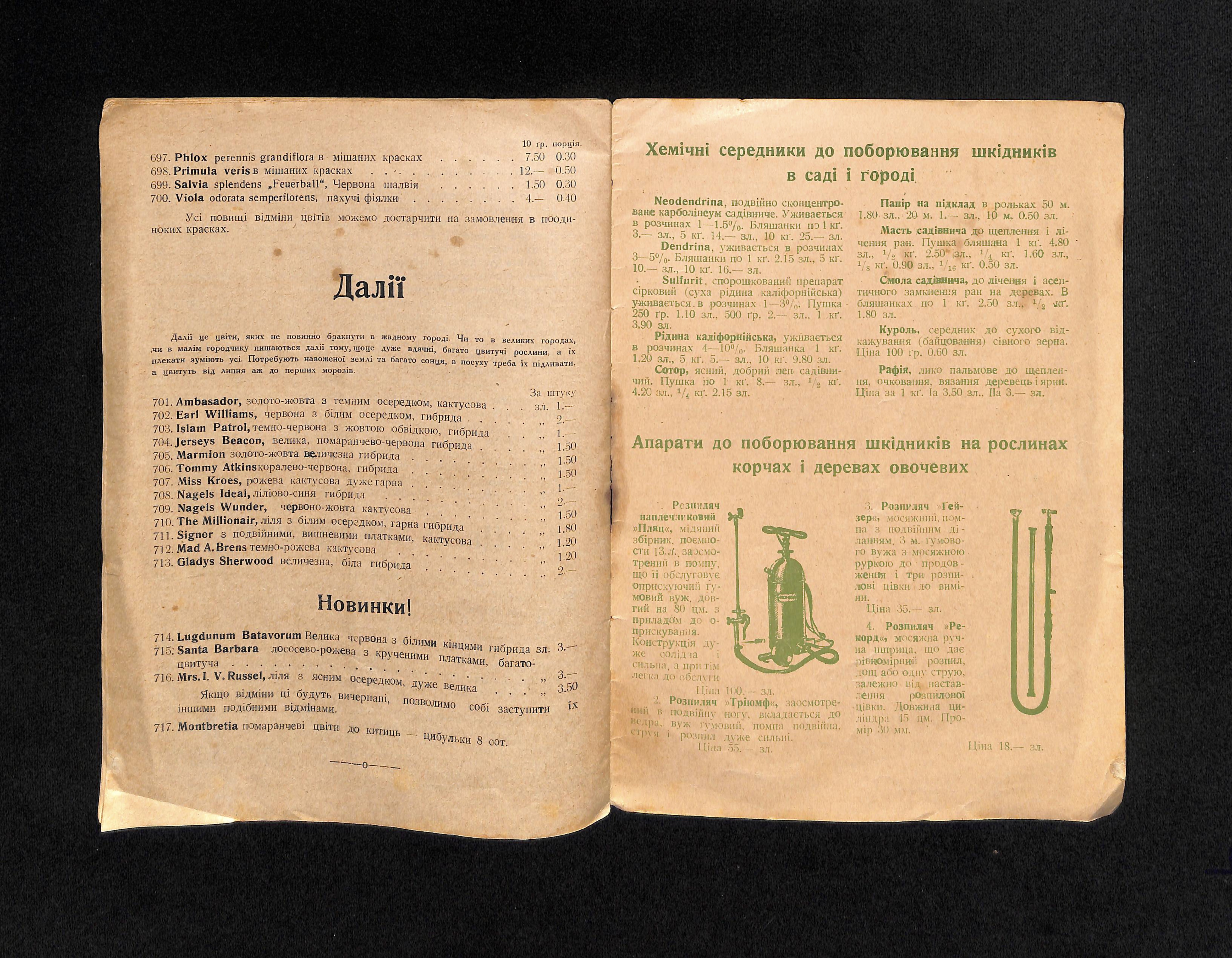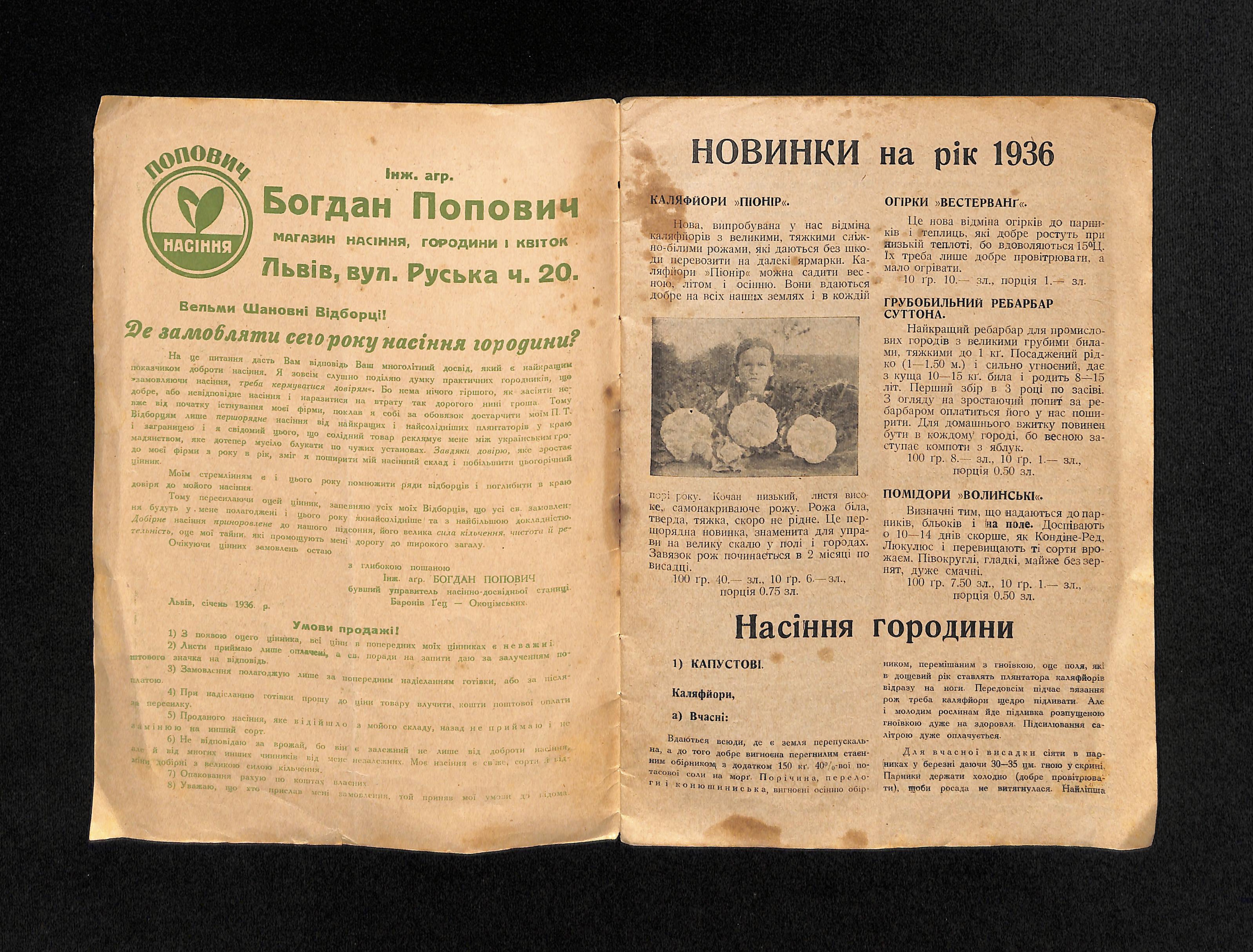 Інж. аґр. Богдан Попович (1936). Цінник насіння городини і квітів [Price list of vegetable and flower seeds]. USSR: Друк 3. Медицький - Тиктор.