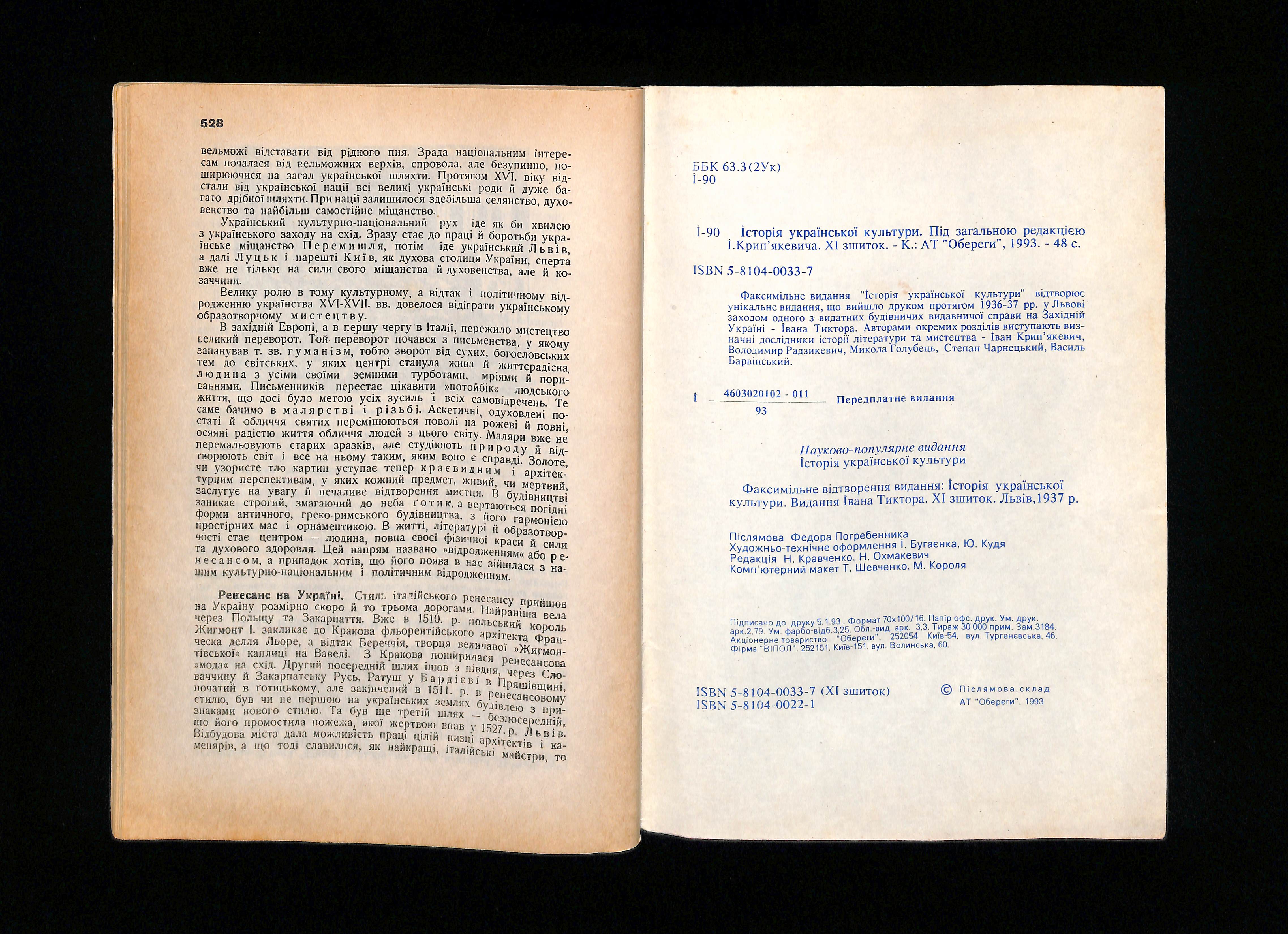 Видання Івана Тиктора (1937). Історія української культури. ХІ зшиток - серпень 1937 [History of Ukrainian Culture. Volume XI - August 1937]. USSR: Обереги.
