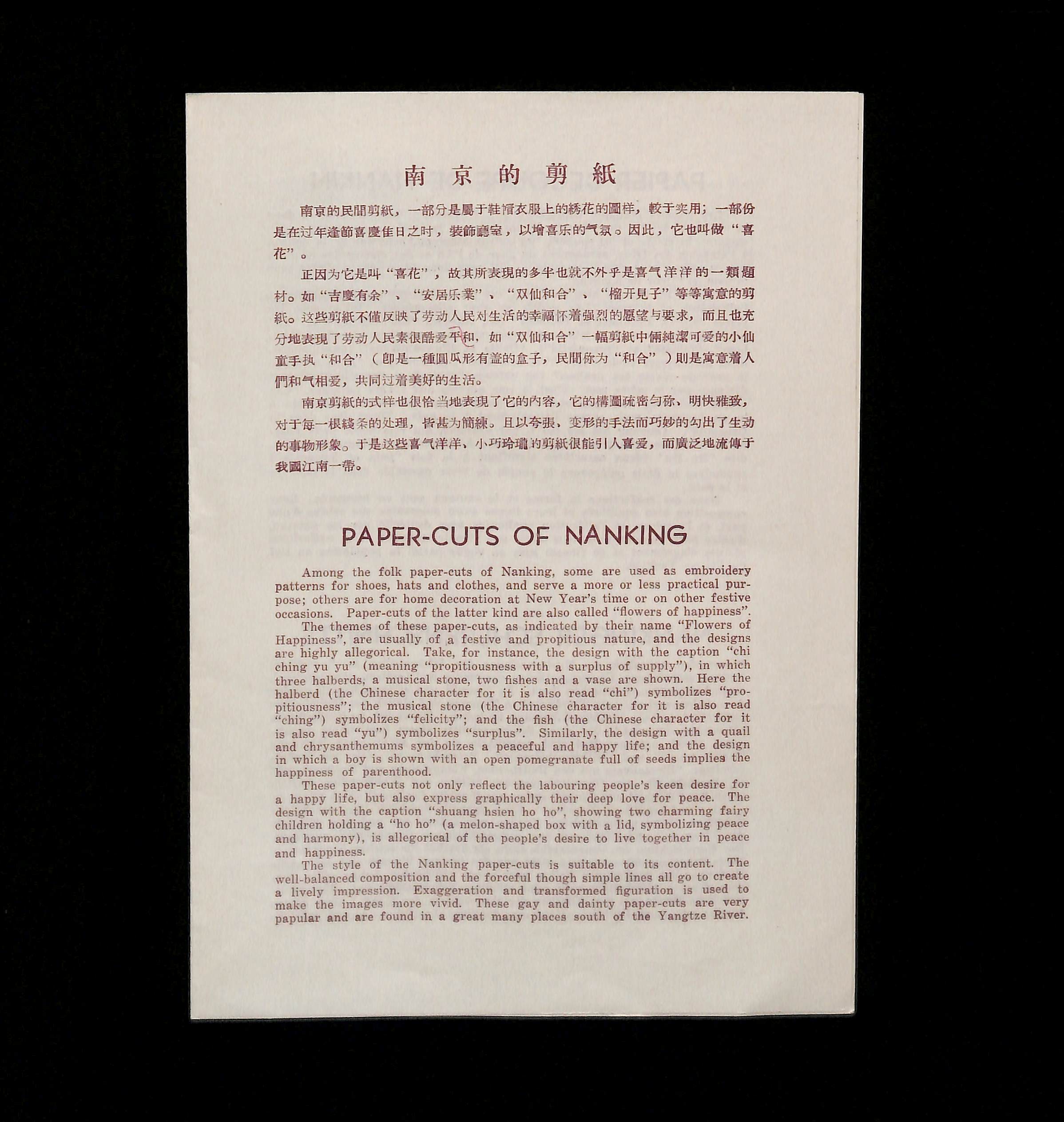 Compiled by The Art Service Department, Union of Chinese Artists (1956). Paper-cuts of Nanking. China: Publisher unknown.