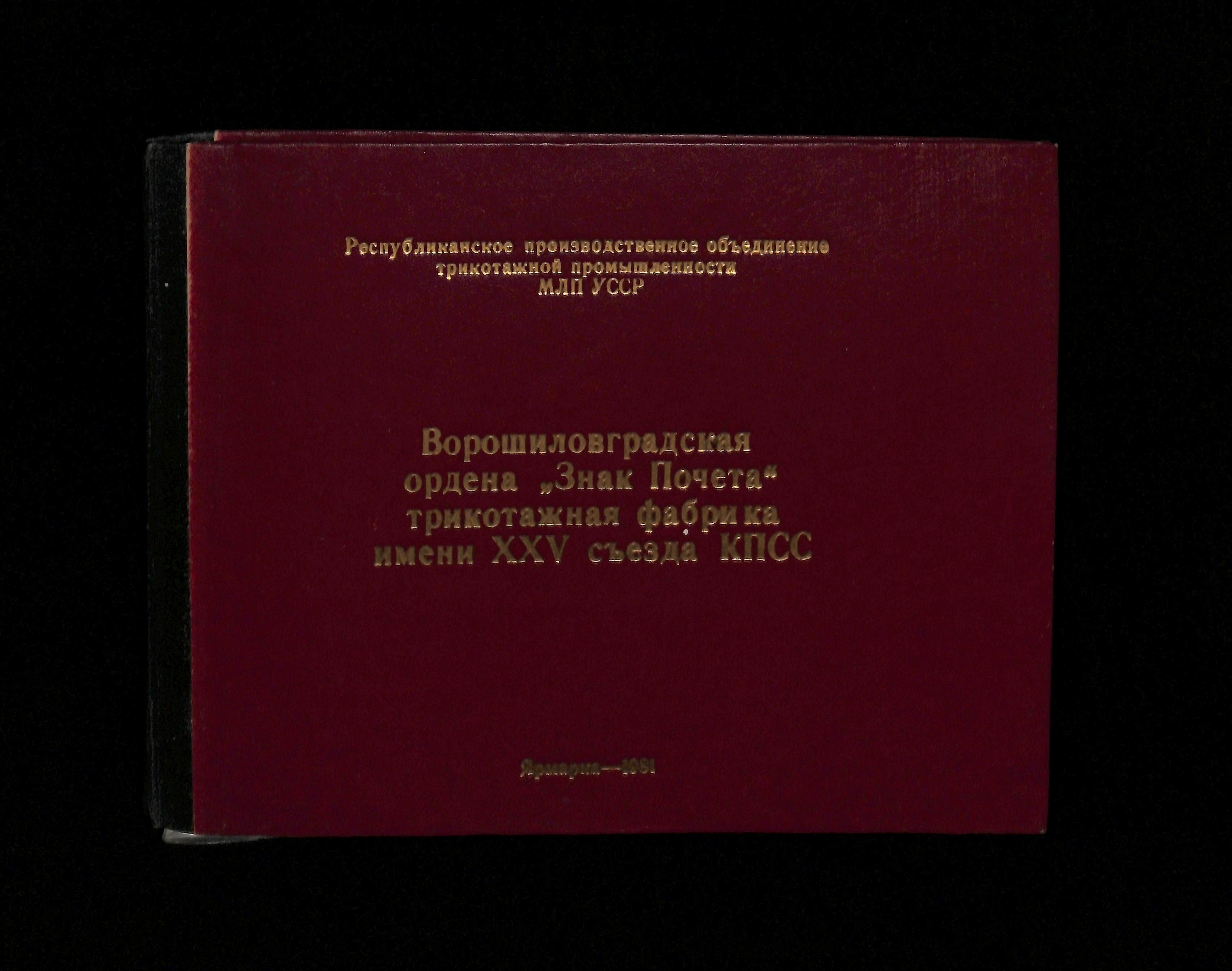 Author unknown (1981). Ворошиловградская ордена "Знак Почета" трикотажная фабрика имени ХХV съезда КПСС [Voroshilovgrad Order of the Badge of Honor Knitwear Factory named after the XXV Congress of the CPSU]. USSR: Publisher unknown.